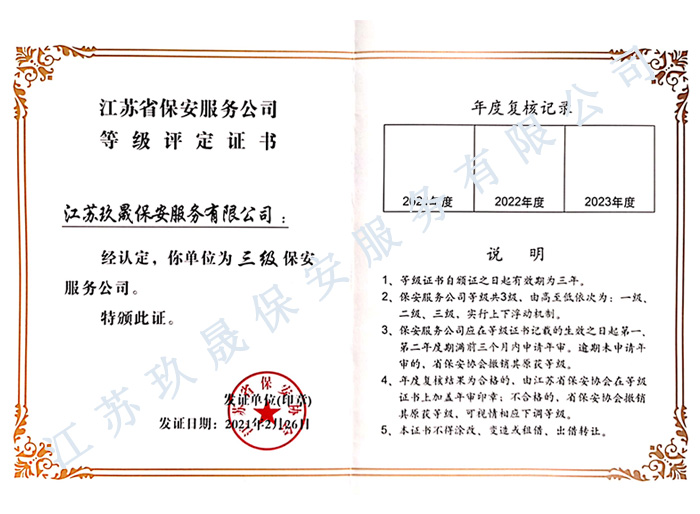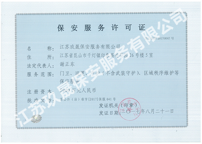 江蘇玖晟保安服務有限公司位于昆山市千燈鎮。注冊資金:2000萬,擁有省公安廳頒發的保安服務許可證的企業,是昆山市保安協會常務理事單位。